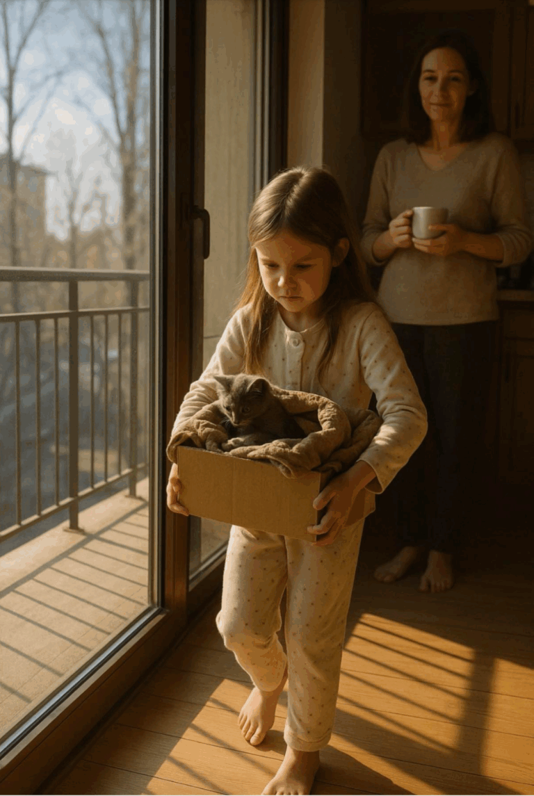 Assim nasceu o plano secreto de Lucy: o gatinho viveria na varanda, em uma caixa, com um cobertor e um pequeno pratinho — até que ficasse forte o suficiente.As primeiras noites foram as mais difíceis. O gatinho chorava, procurando calor, e Lucy, em segredo, levava leite e pequenas porções de comida.