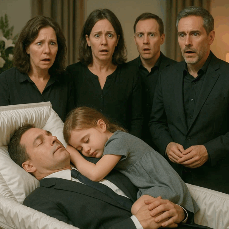 Suas mãos delicadas repousavam na borda do caixão, e seu olhar, fixo e profundo, estava preso ao rosto do pai. Camila não chorava. Não tremia. Apenas olhava — tão intensamente que os adultos sentiam um arrepio diante daquele olhar.