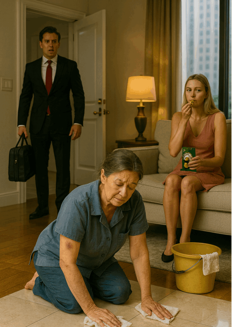 Os olhos de Ethan nunca deixavam sua mãe.“Mãe, venha comer algo,” disse ele suavemente.“Depois que terminar as tarefas,” sussurrou ela, ainda aguardando permissão.Naquela noite, ele assistiu às filmagens. Clare relaxada no sofá, rindo com amigos enquanto Ruth esfregava o chão.