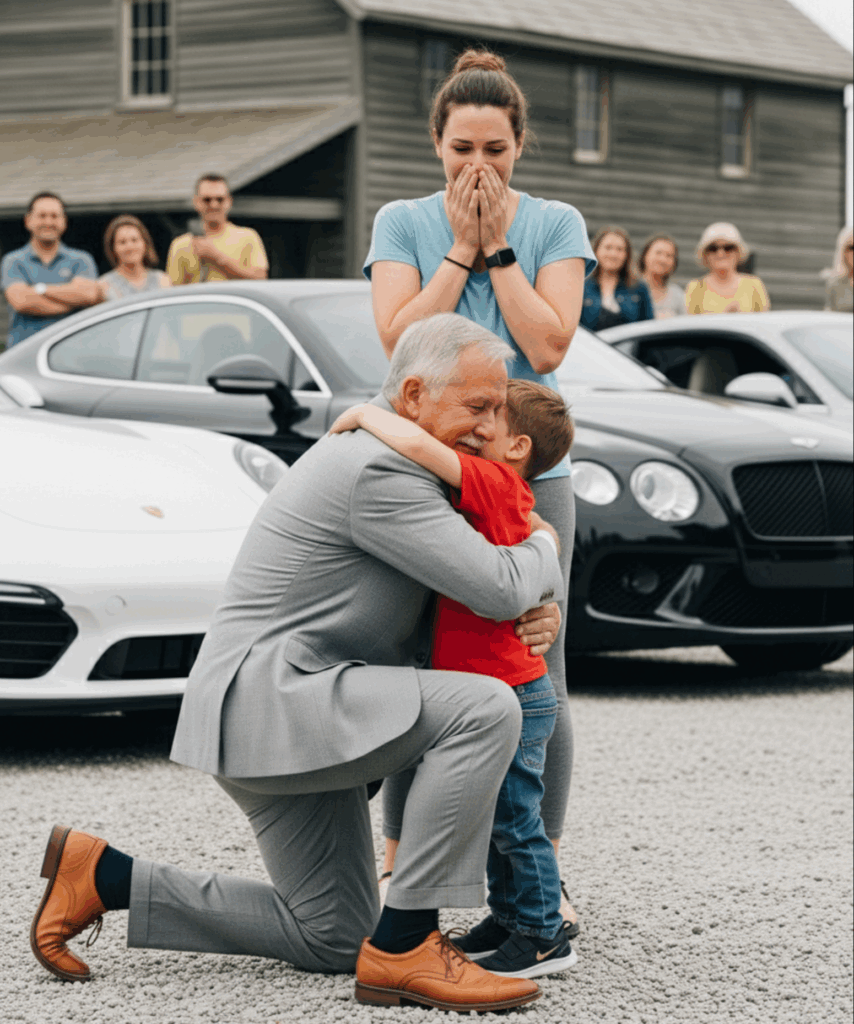 —a mistura estranha de luto, espanto e algo que eu não sabia nomear. Então, sem aviso, ele caiu de joelhos no chão empoeirado.“Finalmente encontrei meu neto”, sussurrou.A rua ficou em silêncio. Cortinas se moveram. Vizinhos espiaram.