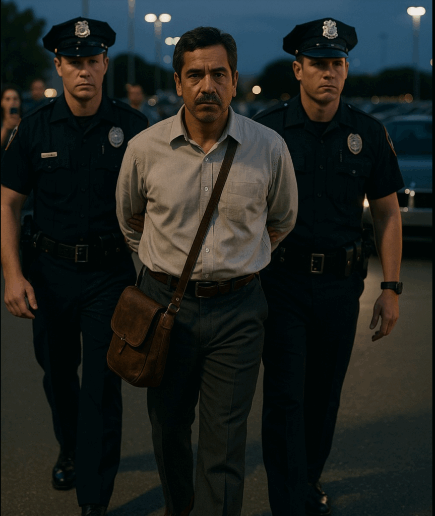 A Prisão Que Ninguém Esperava:A câmera de segurança viu o que ninguém mais viu.Um homem latino, na casa dos quarenta anos — camisa amarrotada, olhos cansados e uma bolsa de couro surrada — foi empurrado de rosto contra o capô de uma viatura policial.