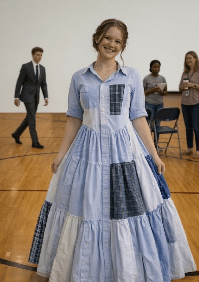 Fui ao baile de formatura vestindo um vestido feito das camisas antigas do meu pai. Queria homenageá-lo — tê-lo comigo, de alguma forma. No início, meus colegas riram, mas em poucos minutos a sala ficou em silêncio, e alguns começaram a se levantar.