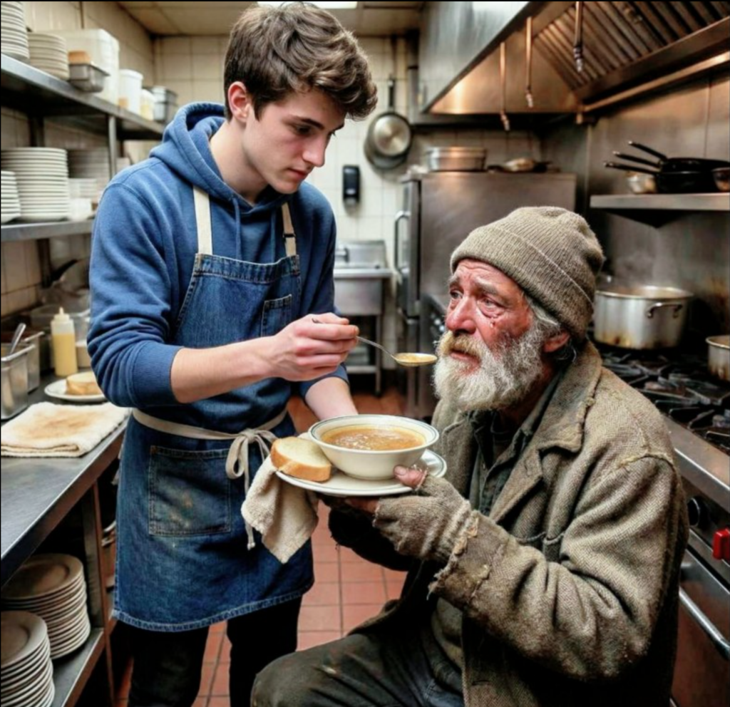 Coloquei uma toalha limpa sobre seus ombros e corri até a cozinha para pegar uma tigela de sopa quente e alguns pães.Quando entreguei a comida, as mãos dele tremiam tanto que quase derrubou a tigela.