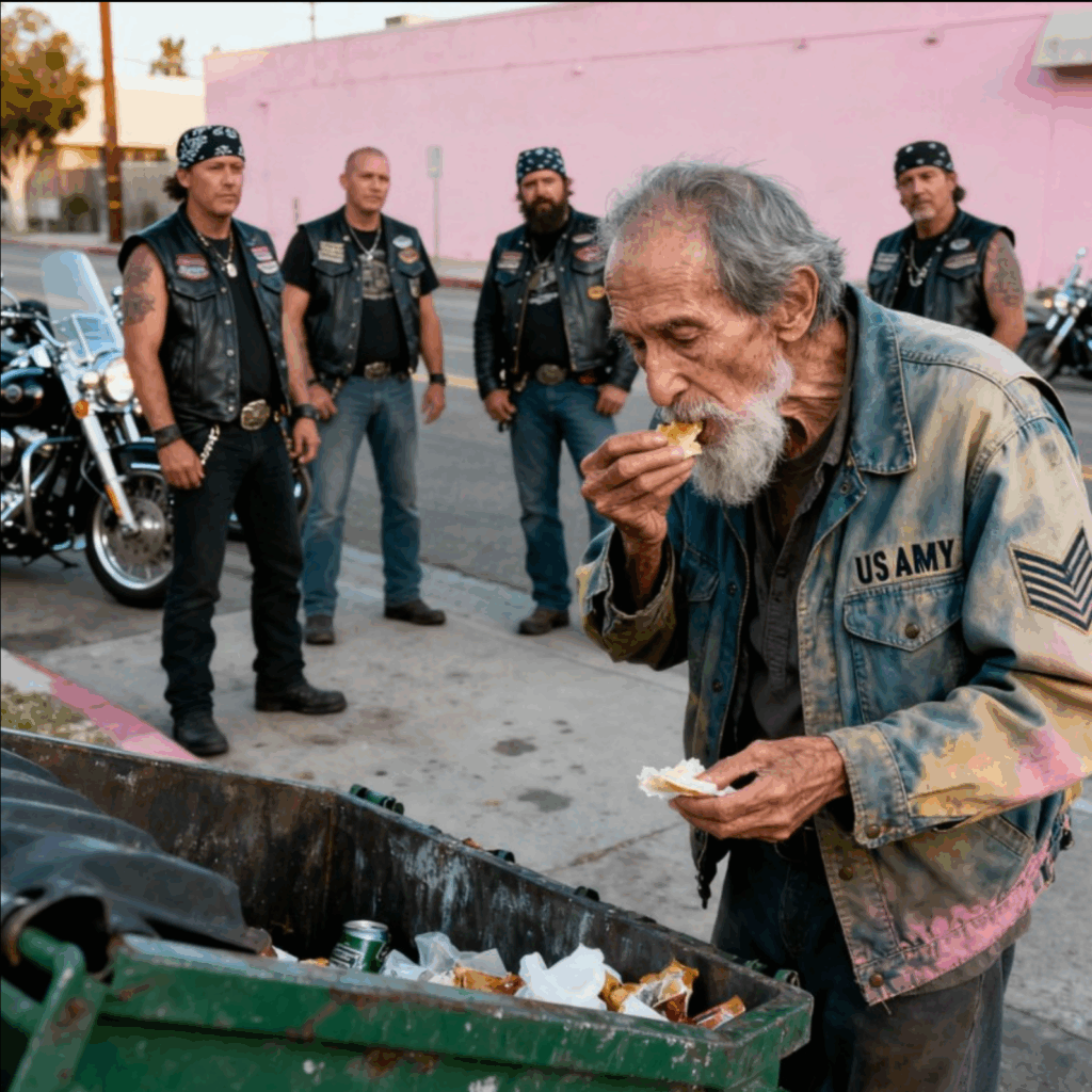 Motociclistas experientes pararam subitamente ao ver um velho revirando um contêiner de lixo, como se cada gesto fosse calculado para conseguir uma refeição mínima.