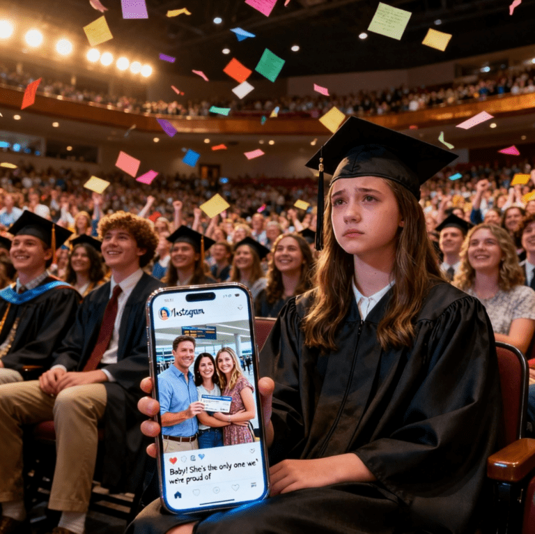 “Itália, querida 🇮🇹✈️✨”, dizia a legenda.Minha mãe havia marcado todos.Exceto eu.Algo se partiu dentro do meu peito.As luzes do ginásio se transformaram em ruído branco. Os chapéus dos formandos se borraram. Bandeiras gritantes com “TURMA DE 20—” se dissolveram em insignificância atrás do brilho do meu celular.