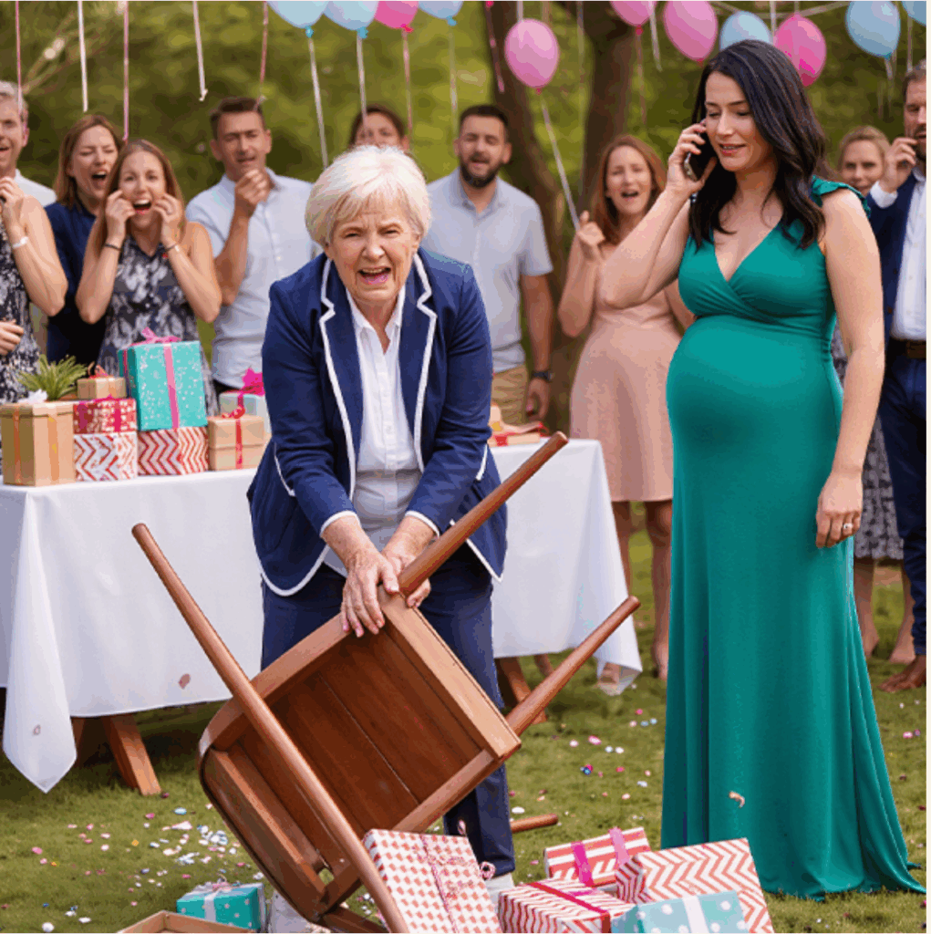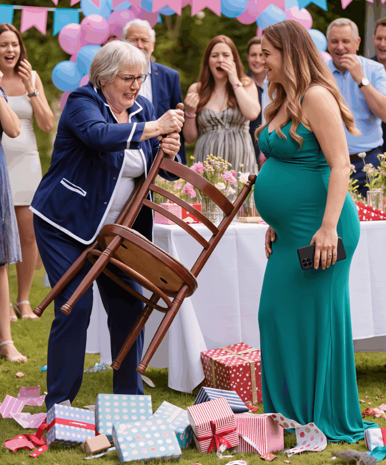 — “O que você disse?” — ela sibilou. — “Este bebê é meu neto! Eu tenho direitos!”Então, com um grito que ecoou pelo quintal, lançou um vaso de cristal contra a parede de tijolos. O vidro se estilhaçou como tiros, os presentes caíram, e os convidados recuaram.