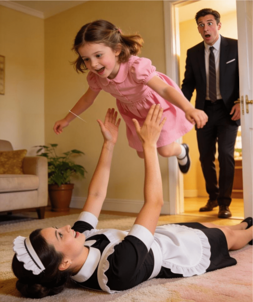 Maria estava deitada de costas, braços estendidos para o alto.E em suas mãos — sua filha.Lily voava como um avião, vestido rosa esvoaçando, braços abertos, rosto iluminado de pura alegria.“O que você está fazendo?!” Daniel gritou.Maria arfou, surpresa, mas não soltou Lily.