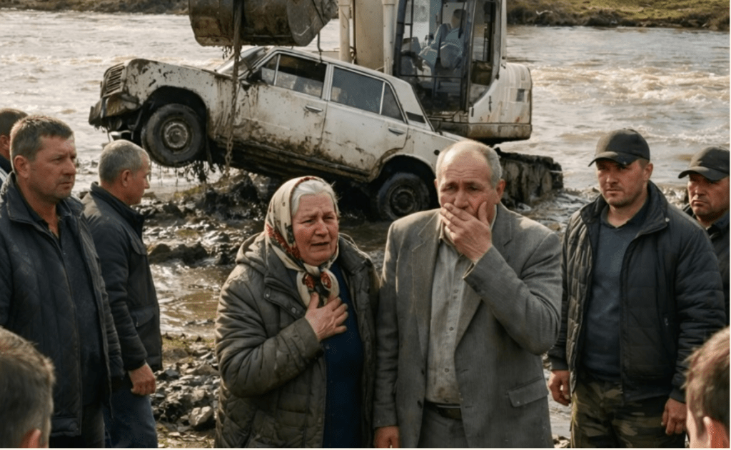 Era um carro.O branco “Hato”.Aquele mesmo.Lentamente, foi retirado para a margem. Pessoas se reuniram, telefones saíram, os sussurros aumentaram. Ninguém queria acreditar… mas não havia erro possível.O carro estava coberto de lama grossa. Os vidros quebrados, a carroceria amassada.