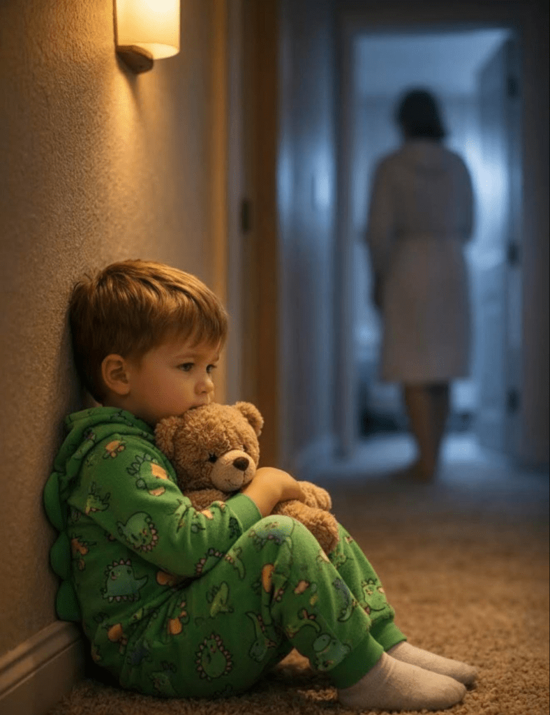— “Filho, onde você está agora?” perguntou o pai, tentando manter a voz calma, mas tremendo de preocupação. “Você está sozinho?”— “Estou no corredor… perto da porta da mamãe,” sussurrou o menino. “Acordei e ouvi ela gritar. Eu bati, mas ela não respondeu.”