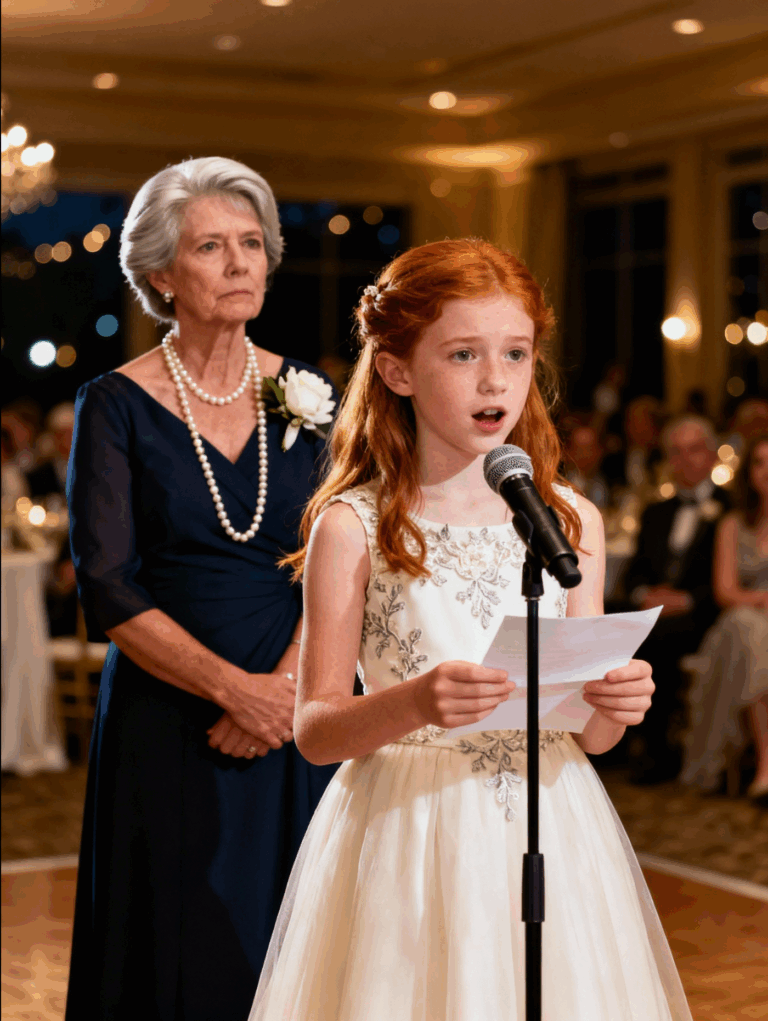 Ela pegou o microfone, tremendo, mas determinada: “Com licença, vovó Patricia. Posso dizer algo? Meu novo papai, Ethan, me deu uma carta para ler se alguém fosse malvado com minha mãe.”