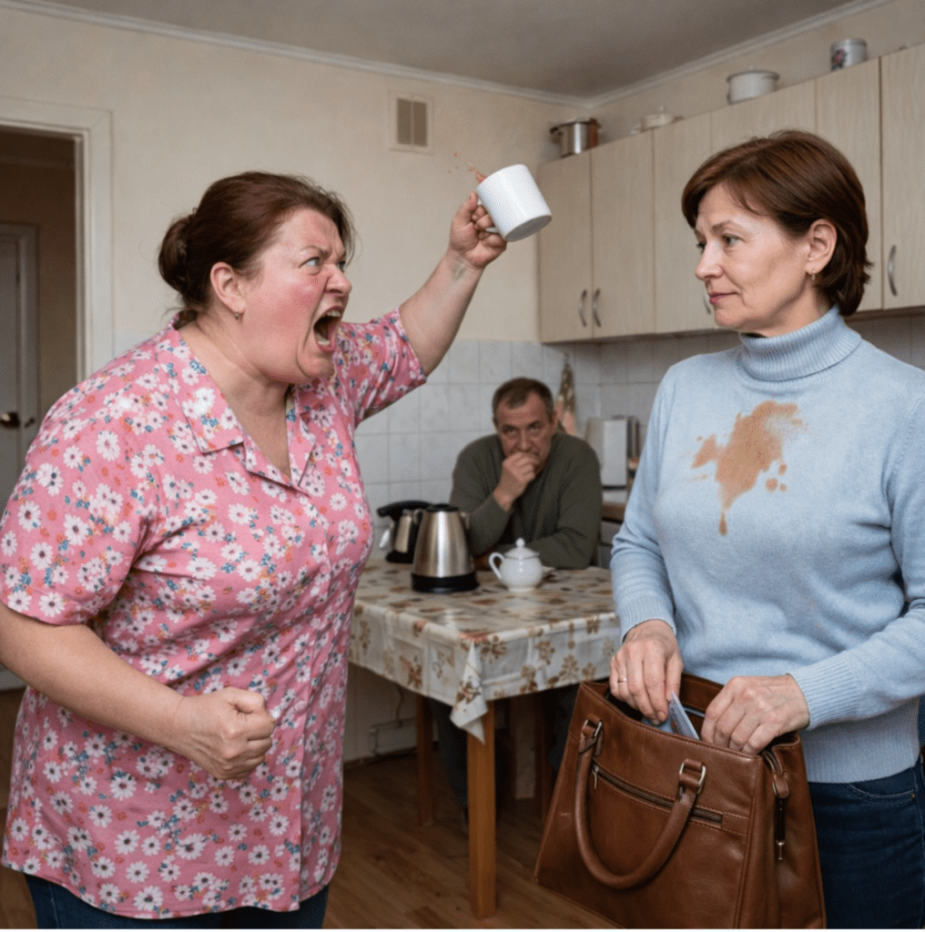 não dizia nada — apenas estava ali, covarde, incapaz, como se tudo aquilo não tivesse nada a ver com ele.À sua frente estava minha mãe, Larissa Mikhailovna. Em sua blusa de gola alta clara, uma mancha escura e úmida se espalhava lentamente — o chá que tinham jogado nela ainda escorria, mas ela não gritava, não tremia.