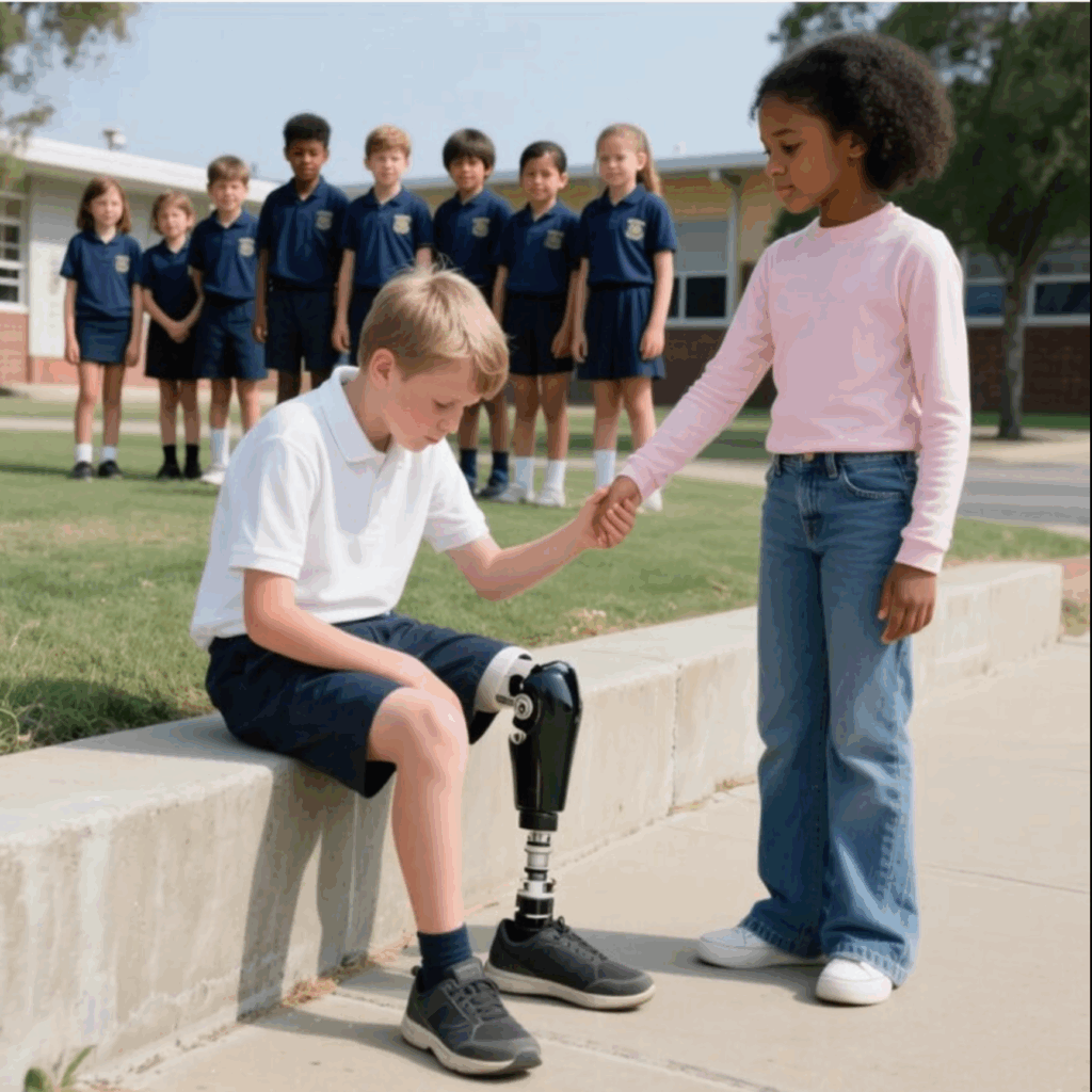 a voz cheia de determinação. “Não. Sou amiga dele.”O pátio ficou em silêncio. O coração de Leo disparou — ninguém jamais havia lhe dito essa palavra na escola: amigo.Mas os valentões não se intimidaram. Riram ainda mais alto,