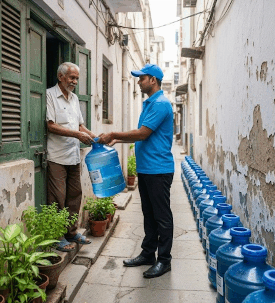 Meu nome é Manoj. Trabalho em uma pequena agência em uma cidade de Uttar Pradesh como entregador de água mineral. É um trabalho cansativo – carregar aqueles garrafões pesados desgasta corpo e mente – mas garante minha renda estável.