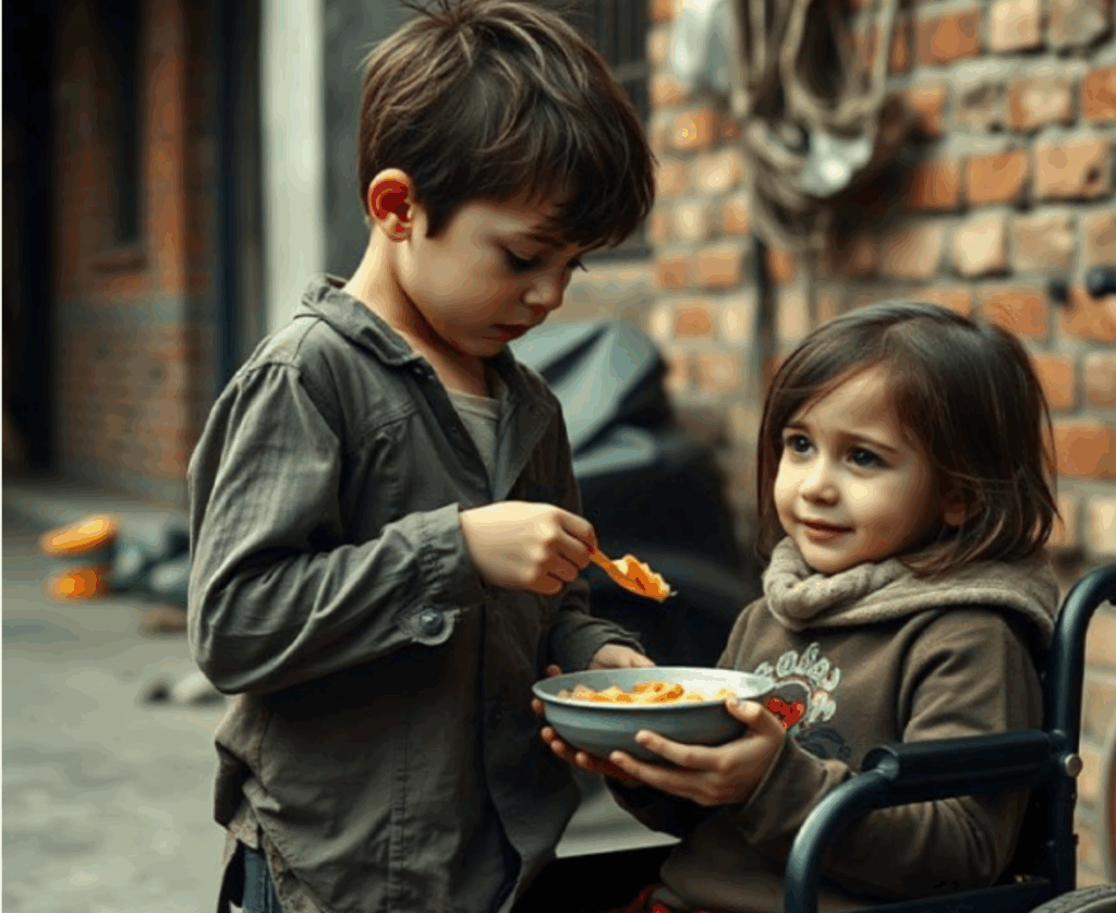 saudável, antes que a doença destruísse tudo. À sua frente, ajoelhado, havia um menino magro, descalço, vestido com roupas simples. Ele a alimentava com uma colher, de uma tigela da qual subia vapor. E Emma comia.