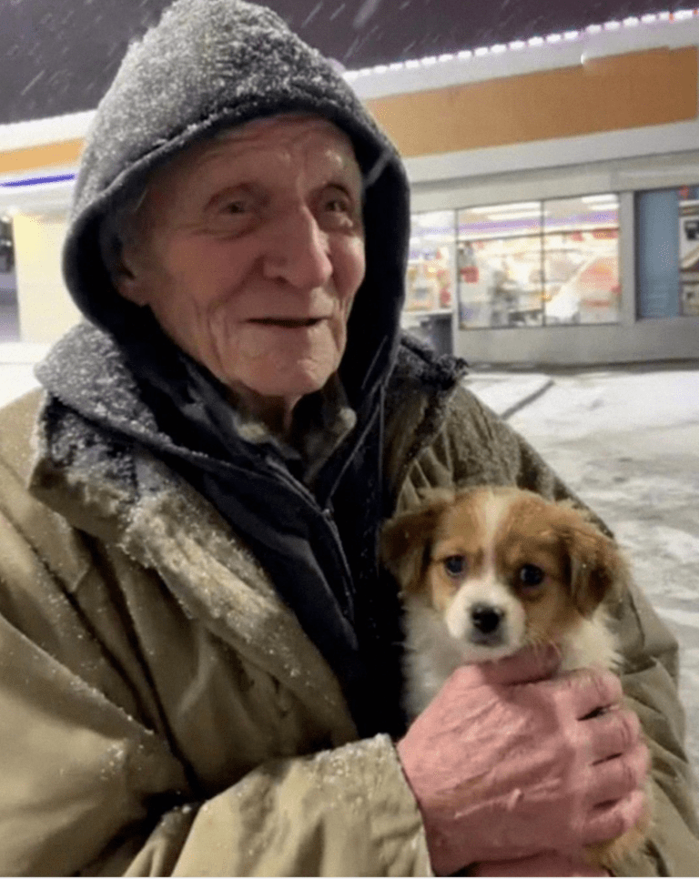 No fim do estacionamento, perto dos carrinhos, um homem estava sentado, curvado sob um casaco velho. A neve se acumulava em seus ombros. Ao lado dele, um pequeno cachorro vermelho e branco descansava a cabeça em seu colo. Não latiu, não chorou — apenas esperava pacientemente.